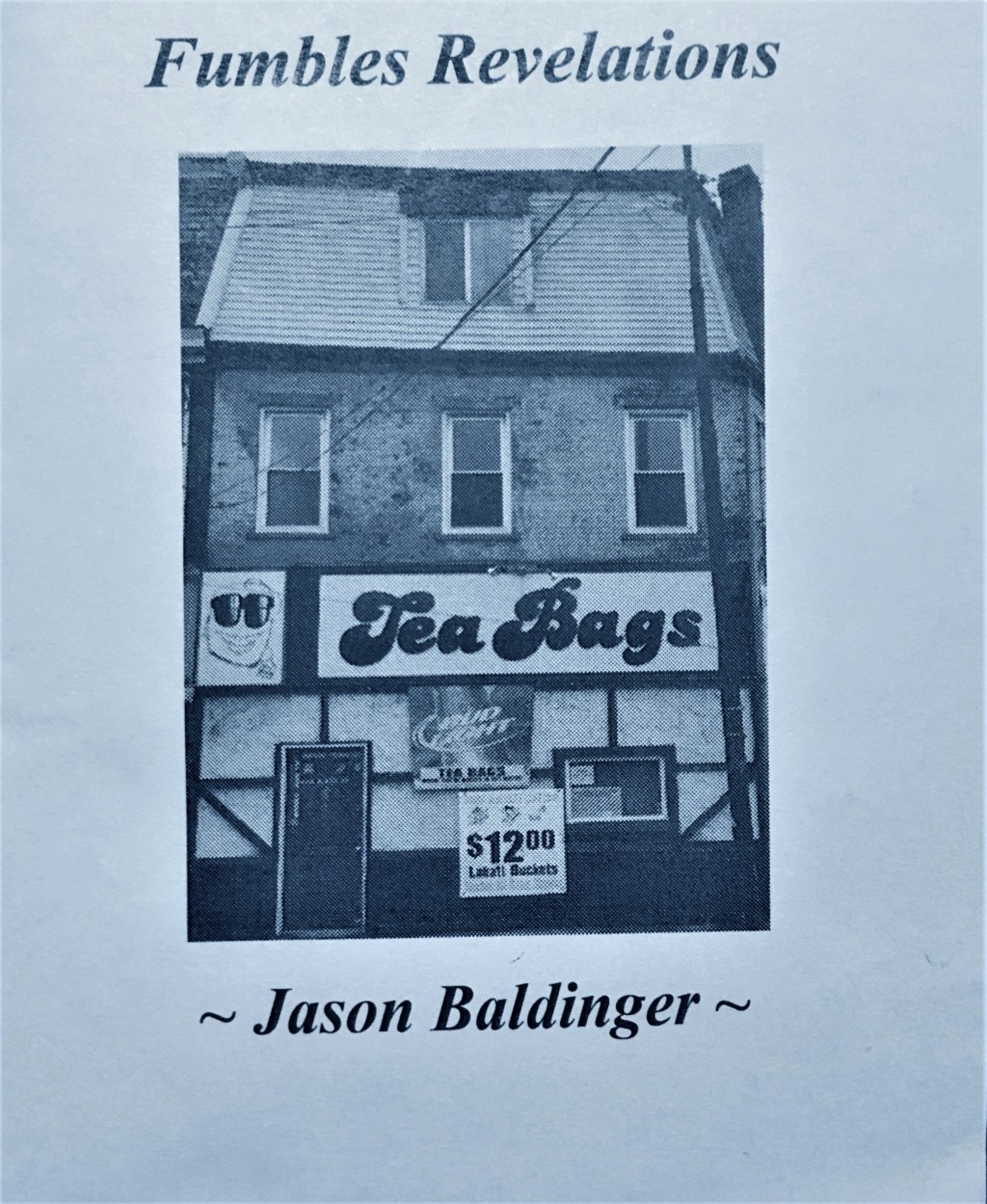 Jason’s chaplet, Fumbles Revelations (2017), is the inaugural release from Don Wentworth’s Grackle and Crow imprint. It is a 16-page booklet, 3½ by 4¼ inches, stuffed full with 15 short but weighty poems. This review will definitely clock in at more words than are in the chaplet: the longest poem is 14 lines, the shortest three. Poetry this compact requires the author to quickly get to the gist of things. Baldinger channels Basho here, and gets it right; he points out a guy at a bus stop who “…thumbs pocket new testament / fumbles revelations…”