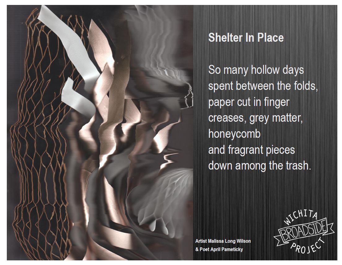 The Wichita Broadside Project is sponsored by Harvester Arts, the Wichita Arts Council, ICT Soup, and River City Poetry. These two selections were collaborations Pameticky participated in directly, but for the most part, she functions as facilitator. Events, both digital and in-person are hosted to create opportunities for artists and poets to meet and discuss opportunities to create new work.